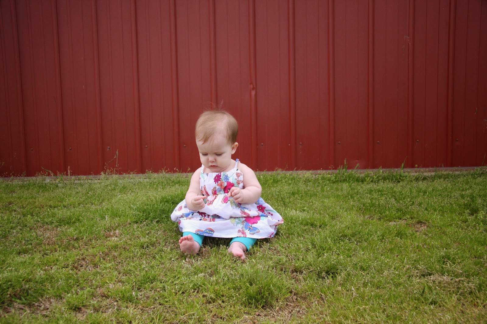 My sweet baby is getting bigger and bigger all the time. She has 4 teeth now (3 were through on her birthday, with a 4th just visible in the gum line). She loves food, but she also still loves breastfeeding. She's gotten confident in her crawling skills and will now track you down into the kitchen from the living room, probably a good 20 feet or so all told. She doesn't do a typical crawl, it's more of a crab walk or a gorilla walk or something. We have hardwood floors, so I don't entirely blame her for not wanting her knees on it.
